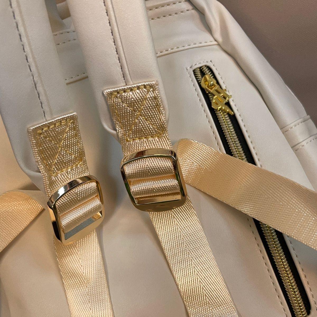 金属製のジッパーと引き手に加え、背面に縦開きのポケット、内ポケット、サイドポケット、前面にレター型ポケットを備えています。サイズ調整用のバックル付きストラップ: